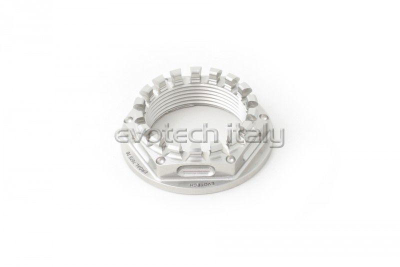 Ergal nuts machined from ergal 7075-T6 bars through sophisticated numerical control machineries. The six pockets and the six frontal holes realized on the nut give it less weight compared to the original component. These lightening don’t preclude the resistance of the product and in fact the chiselling has not been realized on the key torque point. The assembly is very easy: through a simple hexagonal key.