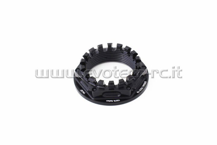 Ergal nuts machined from ergal 7075-T6 bars through sophisticated numerical control machineries. The six pockets and the six frontal holes realized on the nut give it less weight compared to the original component. These lightening don’t preclude the resistance of the product and in fact the chiselling has not been realized on the key torque point. The assembly is very easy: through a simple hexagonal key.