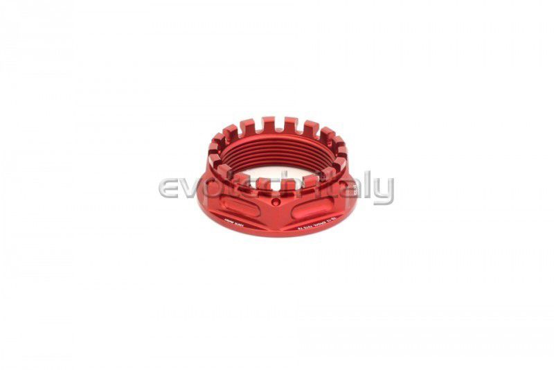 Ergal nuts machined from ergal 7075-T6 bars through sophisticated numerical control machineries. The six pockets and the six frontal holes realized on the nut give it less weight compared to the original component. These lightening don’t preclude the resistance of the product and in fact the chiselling has not been realized on the key torque point. The assembly is very easy: through a simple hexagonal key.