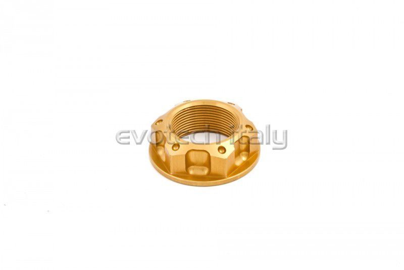Ergal nuts machined from ergal 7075-T6 bars through sophisticated numerical control machineries. The six pockets and the six frontal holes realized on the nut give it less weight compared to the original component. These lightening don’t preclude the resistance of the product and in fact the chiselling has not been realized on the key torque point. The assembly is very easy: through a simple hexagonal key.