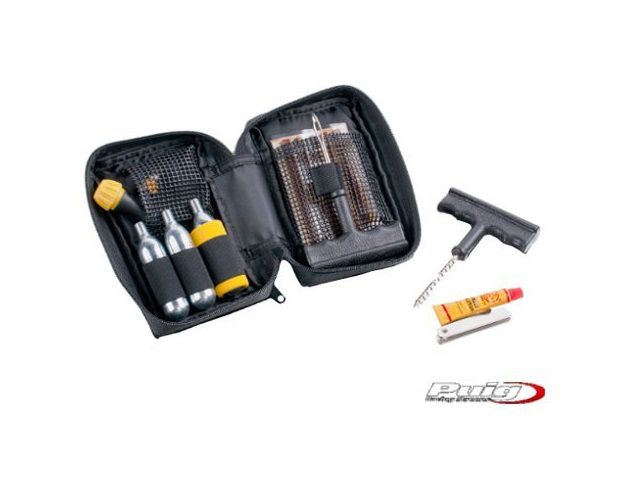 Uitgebreid banden reparatie setje voor pech onderweg. Alles zit er in om een band te repeareren en op te pompen.