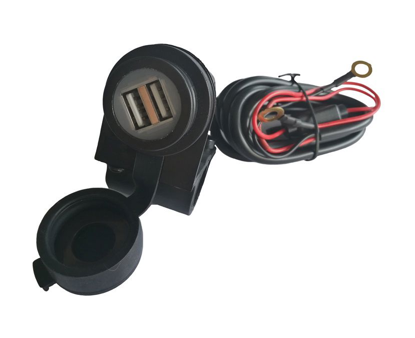 Dubbele USB HighPower aansluiting van het merk Chaft Input: 12V ~ 24 V Output: 5V/ 2x2,1A 120cm lange aansluit kabel Siliconen afdekdop Waterdicht en van hoge kwaliteit Geleverd met houder voor stuur (ø 22 mm)