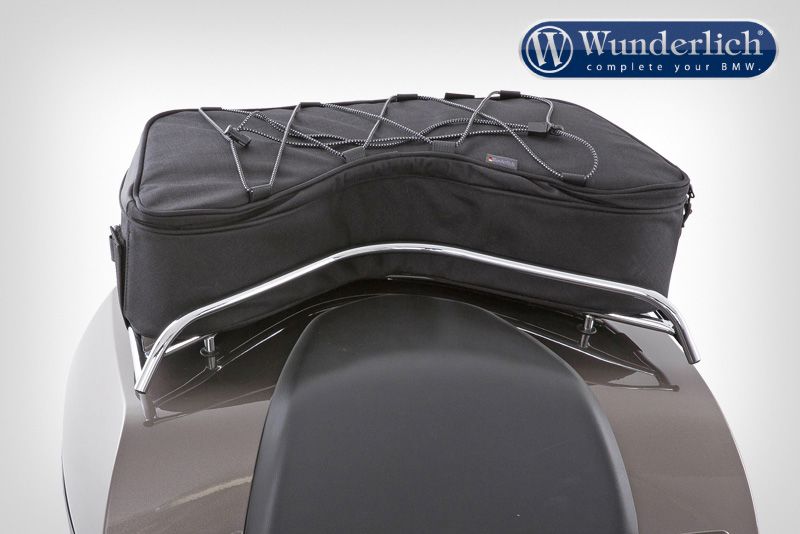 The top case bag has been precisely tailored in form and function to our top case railing. This means the bag seamlessly assumes the design of the top case and this leads to a visually appealing luggage solution.The facts:- Four straps for a secure hold on our top case railing.- Holds 15l content- Quick attachment via durable velcro closures.- Zigzag elastic on the top for quick storage of gloves, etc.- Interior reinforcement for optimum form stability.- Bright inner lining allows for greater clarity and things can no longer disappear into the cracks.- Ergonomic zip puller.- Water-repellent, Teflon-coated CORDURA fabric. Highly durable, non-abrasive and totally UV-resistant.- Ergonomic carrying handle.- Low tare weight.- Made in EuropeElephant bag for top case railing BMW K1600 Grand America/GT/GTL - black WunderlichEigenschappen: