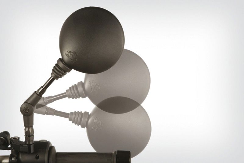 The ingenious mirror range, with continuously adjustable angle and stem length (Flash). If necessary the mirror bodies can be folded away completely. This solves problems such as the limited rear view of following trafficor a design that is too wide to go through narrow spaces. In case of a fall when the mirror are in the regular position the folding hinge gives the mirror an extended folding range, and the built-in friction clutch allows the mirror to rotate around its mounting point, preventing damage. Convex mirror glass for an extended field of vision (magnifying effect). The facts: