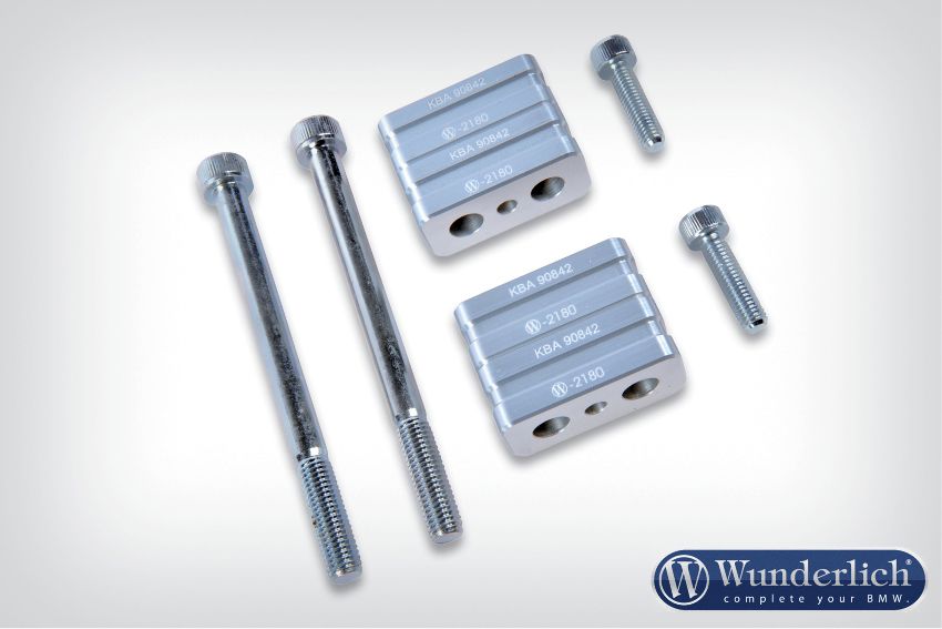 A barely-visible adjustment with a resounding effect:- Height increase of 20 mm, 25 mm, 35 mm or 40 mm (depending on model).- Improved handling.- More direct riding feel.- Relaxed, upright riding posture.- Now it is possible to stand up when riding off-road riding without tiring and with better control.- Also available for vehicles with BMW navigation systems.- No modification to the vehicle necessary.- Individually milled from strong Dural aluminium (not cast!).- Black (up to 2007) or silver (from 2008) anodised.- Complete with bolt set.- ABE approved/TÜV approval.- Made in Germany.In every respect a huge gain in rider comfort and improved handling feel. The GS feels even lighter and more agile. Simple to fit in seconds and without the need for any other modifications. The increased height allows more adjustment of the handlebar tilt to further improve the sitting position. We recommend the 20 mm or 25 mm extension for riders of up to 1.75 metres tall, and the 35 mm or 40 mm extension for riders taller than thatHandlebar riser 40mm BMW R1200GS/Adventure '08-- silver WunderlichEigenschappen:
