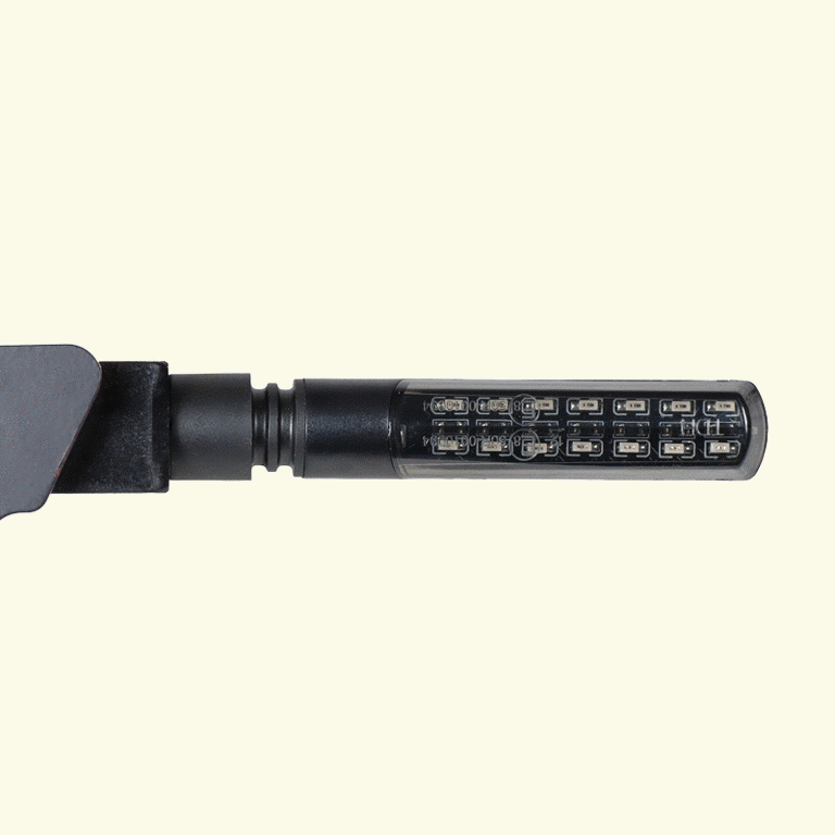 Het betreft een dynamisch knipperlicht wat is voorzien van een rijtje rode led lampjes, voor extra zichtbaarheid/achterlicht.
