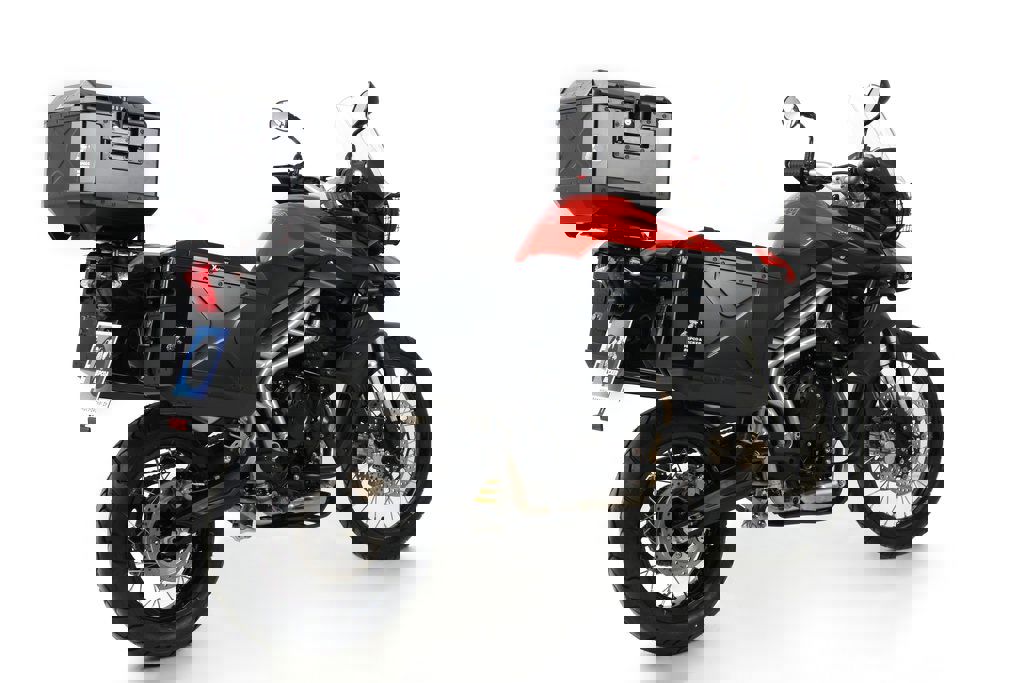 Het betreft hier een asymmetrische zijdragerset. Aan de kant van de uitlaatdemper is het kofferrek verder van de achterzijde van de motor gemonteerd. Om de kofferset ongeveer symmetrisch te houden kan er gekozen worden voor een enduroset. Hierbij is de koffer aan de uitlaatzijde smaller dan aan de niet-uitlaatzijde.Knipperlichten blijven op de originele plek.