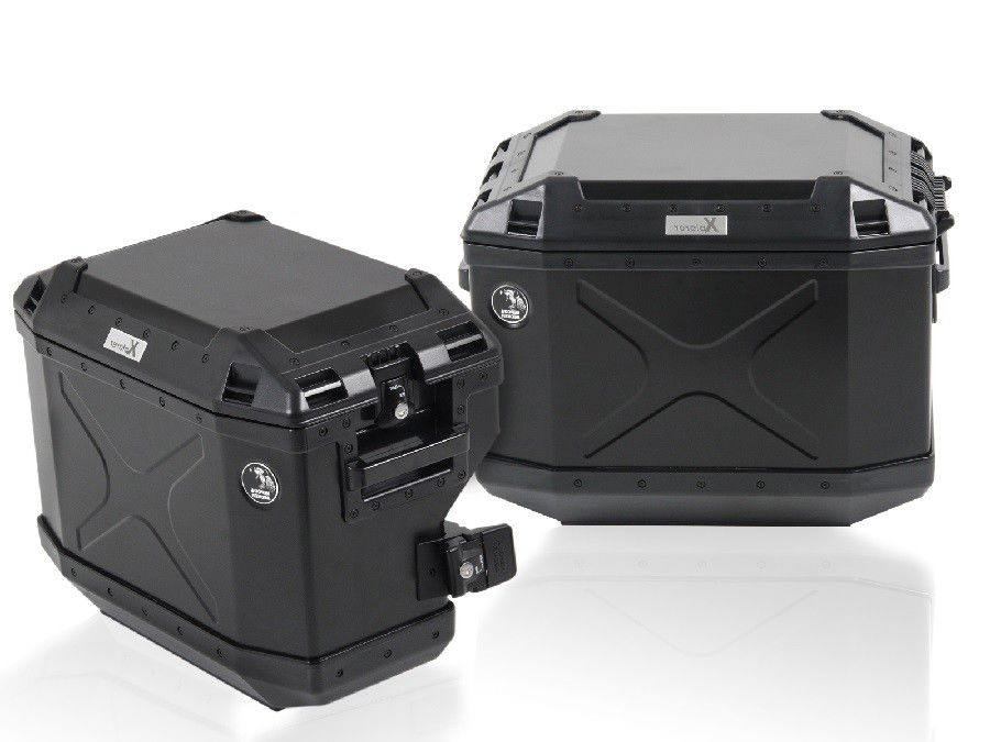 Complete kofferset van Hepco&Becker. Bestaat uit een RVS kofferrek en een set Xplorer BLACK zijkoffers (37/40 liter).