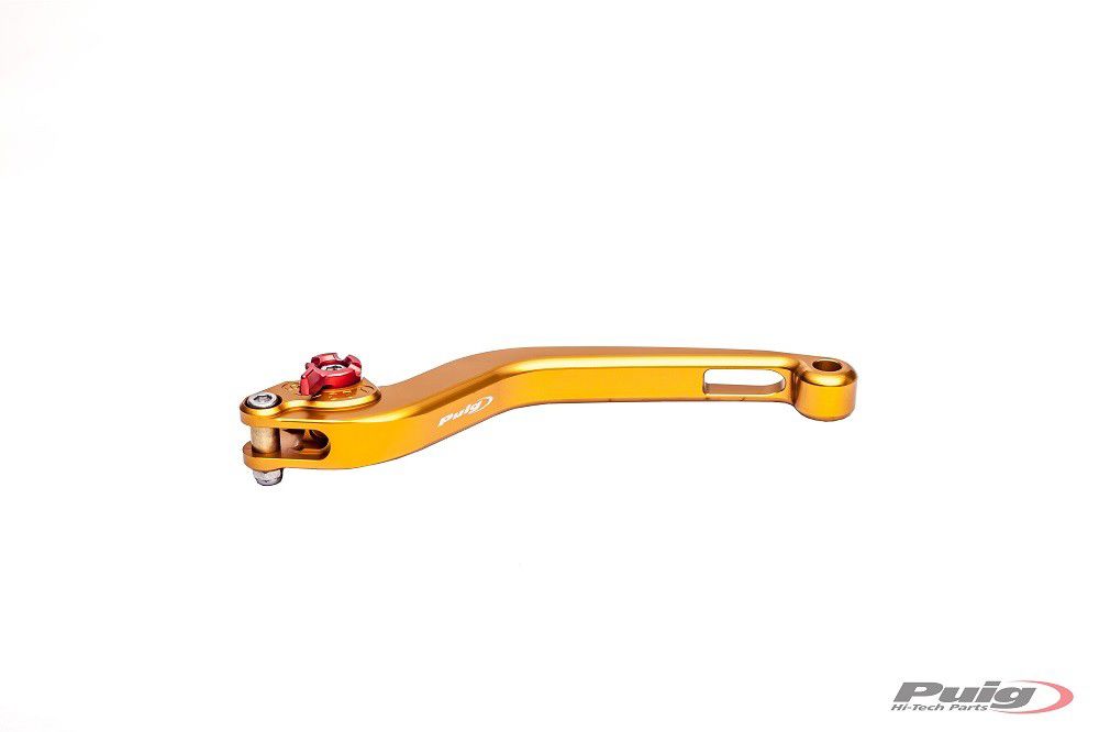 Losse koppelingshendel van het merk Puig. De hendel kan eenvoudig op een Puig koppelingsadapter gemonteerd worden. De kleur van de hendel is goud en de versteller rood.