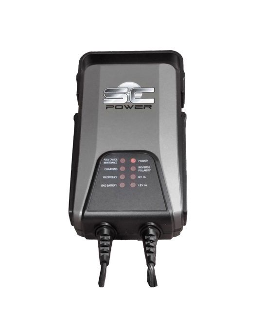De SC Power premium charger is een handige (onderhouds) lader voor motoren, brommers, scooters, grasmaaiers en alles waar een kleine accu in zit. Geschikt voor alle 6 en 12 volt accu's (GEEN lithium) tot ca. 30 ah. Onderhoudsladen kan tot wel 60 ah. Tijdens het laden voert de geavanceerde microprocessor 9 verschillende laad- en inspectiefuncties uit voor het beste resultaat van elke accu. De lader is beveiligd tegen ongeveer alles wat mis kan gaan, zoals kortsluiting, vonken, omgekeerde polariteit, overbelasting en oververhitting. Als de accu vol is stopt de lader automatisch.