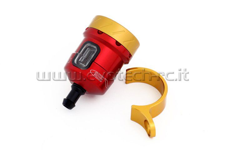 Mooi aluminium gefreesd remvloeistofpotje met kijkglas van Evotech Het reservoir wordt geleverd in rood, de deksel en de beugel in goud Inhoud 15ml Leverbaar in diverse kleurcombinaties, het reservoir en de deksel+beugel kunnen in de gewenste kleur besteld worden. Het reservoir kan worden gebruikt voor de achterrem en koppeling.