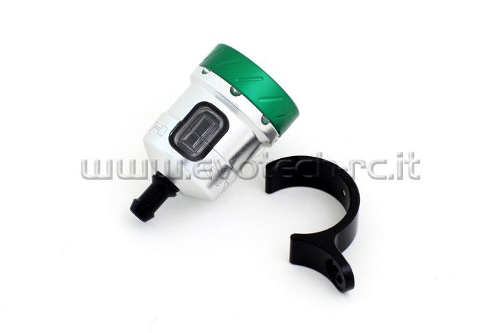 Mooi aluminium gefreesd remvloeistofpotje met kijkglas van Evotech Het reservoir wordt geleverd in zilver, de deksel in groen en de beugel in zwart Inhoud 15ml Leverbaar in diverse kleurcombinaties, het reservoir en de deksel+beugel kunnen in de gewenste kleur besteld worden. Het reservoir kan worden gebruikt voor de achterrem en koppeling.