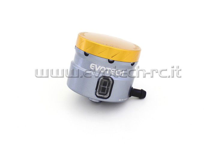 Zeer mooi aluminium remvloeistofpotje met kijkglas van Evotech. Titanium potje met goude dekselHet potje is bedoeld voor de voorrem en heeft een haakse uitgang. Inhoud 30mlWordt geleverd met ophangbeugeltje. De deksel en het reservoir zijn in verschillende kleuren leverbaar. Remvloeistofpotje Evotech groot met haakse uitgangThe new Evotech front brake reservoir (DOT 4 compatible) has been designed both for racing use and to give a touch of beautiful style to your motorcycle. Can be matched in 36 different color combinations by choosing cap and body colors. All are equipped with a unique vent circuit able to control the liquid level during consumption. Eigenschappen:Merk: EvotechRemtechniekdiversen: remvloeistofpotjes EvotechOnderdeelsoort: remtechniek
