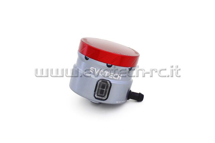Zeer mooi aluminium remvloeistofpotje met kijkglas van Evotech. Titanium potje met rode dekselHet potje is bedoeld voor de voorrem en heeft een haakse uitgang. Inhoud 30mlWordt geleverd met ophangbeugeltje. De deksel en het reservoir zijn in verschillende kleuren leverbaar. Remvloeistofpotje Evotech groot met haakse uitgangThe new Evotech front brake reservoir (DOT 4 compatible) has been designed both for racing use and to give a touch of beautiful style to your motorcycle. Can be matched in 36 different color combinations by choosing cap and body colors. All are equipped with a unique vent circuit able to control the liquid level during consumption. Eigenschappen:Merk: EvotechRemtechniekdiversen: remvloeistofpotjes EvotechOnderdeelsoort: remtechniek