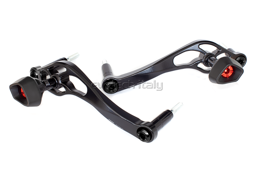 De nieuwe Evotech anti-schok frame sliders zijn ontworpen met het oog op het opvangen van de gevolgen van een val. Dit betekent dat het effect wordt geabsorbeerd door de sliders in plaats van direct op het frame. Bij een val wordt de slider over een conische spacer geschoven. Hierdoor wordt de energie van de impact verlaagd. Tests die zijn uitgevoerd in zowel laboratorium en op straat toonde een significante daling van de impact op het frame ten opzichte van de normale sliders. De slider is gemaakt van een kunststof mix met glasvezel. Het combineert high impact absorptie en glijweerstand tot lage wrijving op het asfalt. Op deze manier glijdt de pad over het asfalt zonder overmatige slijtage en gevaarlijke 'springen'. De aerodynamische vorm van de slider geeft niet alleen een agressievere look aan de motor, maar vermindert ook de kans dat de slider blijft hangen achter een obstakel. Op de slider is ook een markering/schaal aangebracht zodat na een val een indicatie van de kracht wordt gegraveerd. De main body is gemaakt van vliegtuig billet aluminium en zwart geanodiseerd voor een lange levensduur. De set is speciaal gemaakt om de impact van een val te verlagen aan het frame. Alle onderdelen zijn los leverbaar.