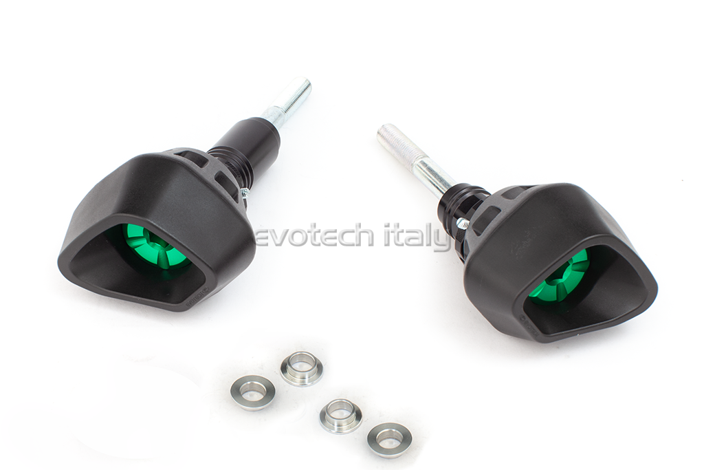 De nieuwe Evotech anti-schok frame sliders zijn ontworpen met het oog op het opvangen van de gevolgen van een val. Dit betekent dat het effect wordt geabsorbeerd door de sliders in plaats van direct op het frame. Bij een val wordt de slider over een conische spacer geschoven. Hierdoor wordt de energie van de impact verlaagd. Tests die zijn uitgevoerd in zowel laboratorium en op straat toonde een significante daling van de impact op het frame ten opzichte van de normale sliders. De slider is gemaakt van een kunststof mix met glasvezel. Het combineert high impact absorptie en glijweerstand tot lage wrijving op het asfalt. Op deze manier glijdt de pad over het asfalt zonder overmatige slijtage en gevaarlijke 'springen'. De aerodynamische vorm van de slider geeft niet alleen een agressievere look aan de motor, maar vermindert ook de kans dat de slider blijft hangen achter een obstakel. Op de slider is ook een markering/schaal aangebracht zodat na een val een indicatie van de kracht wordt gegraveerd. De main body is gemaakt van vliegtuig billet aluminium en zwart geanodiseerd voor een lange levensduur. De set is speciaal gemaakt om de impact van een val te verlagen aan het frame. Alle onderdelen zijn los leverbaar.