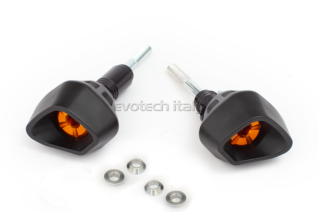 De nieuwe Evotech anti-schok frame sliders zijn ontworpen met het oog op het opvangen van de gevolgen van een val. Dit betekent dat het effect wordt geabsorbeerd door de sliders in plaats van direct op het frame. Bij een val wordt de slider over een conische spacer geschoven. Hierdoor wordt de energie van de impact verlaagd. Tests die zijn uitgevoerd in zowel laboratorium en op straat toonde een significante daling van de impact op het frame ten opzichte van de normale sliders. De slider is gemaakt van een kunststof mix met glasvezel. Het combineert high impact absorptie en glijweerstand tot lage wrijving op het asfalt. Op deze manier glijdt de pad over het asfalt zonder overmatige slijtage en gevaarlijke 'springen'. De aërodynamische vorm van de slider geeft niet alleen een agressievere look aan de motor, maar vermindert ook de kans dat de slider blijft hangen achter een obstakel. Op de slider is ook een markering/schaal aangebracht zodat na een val een indicatie van de kracht wordt gegraveerd. De main body is gemaakt van vliegtuig billet aluminium en zwart geanodiseerd voor een lange levensduur. De set is speciaal gemaakt om de impact van een val te verlagen aan het frame. Alle onderdelen zijn los leverbaar.