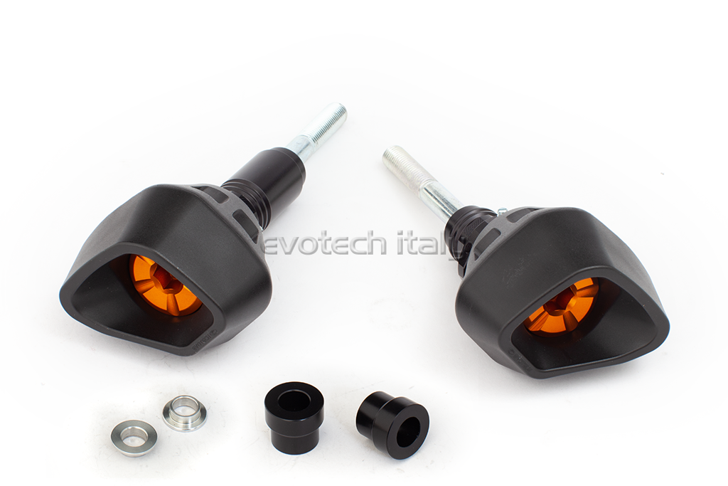 De nieuwe Evotech anti-schok frame sliders zijn ontworpen met het oog op het opvangen van de gevolgen van een val. Dit betekent dat het effect wordt geabsorbeerd door de sliders in plaats van direct op het frame. Bij een val wordt de slider over een conische spacer geschoven. Hierdoor wordt de energie van de impact verlaagd. Tests die zijn uitgevoerd in zowel laboratorium en op straat toonde een significante daling van de impact op het frame ten opzichte van de normale sliders. De slider is gemaakt van een kunststof mix met glasvezel. Het combineert high impact absorptie en glijweerstand tot lage wrijving op het asfalt. Op deze manier glijdt de pad over het asfalt zonder overmatige slijtage en gevaarlijke 'springen'. De aerodynamische vorm van de slider geeft niet alleen een agressievere look aan de motor, maar vermindert ook de kans dat de slider blijft hangen achter een obstakel. Op de slider is ook een markering/schaal aangebracht zodat na een val een indicatie van de kracht wordt gegraveerd. De main body is gemaakt van vliegtuig billet aluminium en zwart geanodiseerd voor een lange levensduur. De set is speciaal gemaakt om de impact van een val te verlagen aan het frame. Alle onderdelen zijn los leverbaar.