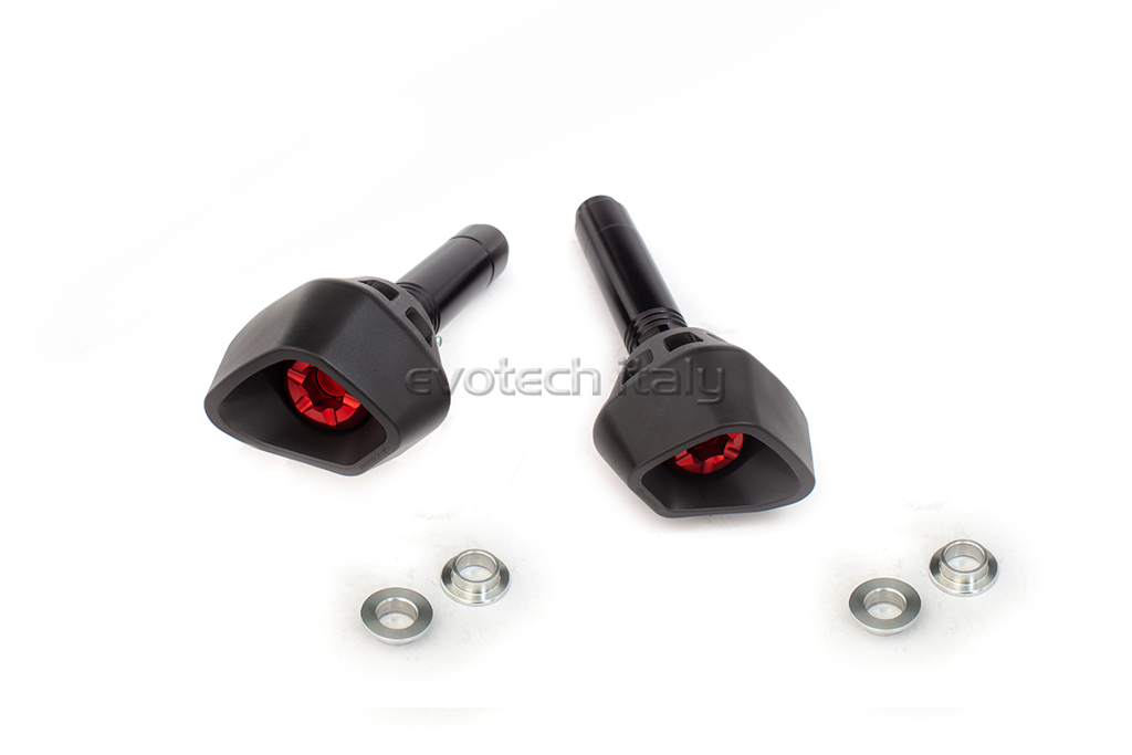 De nieuwe Evotech anti-schok frame sliders zijn ontworpen met het oog op het opvangen van de gevolgen van een val. Dit betekent dat het effect wordt geabsorbeerd door de sliders in plaats van direct op het frame. Bij een val wordt de slider over een conische spacer geschoven. Hierdoor wordt de energie van de impact verlaagd. Tests die zijn uitgevoerd in zowel laboratorium en op straat toonde een significante daling van de impact op het frame ten opzichte van de normale sliders. De slider is gemaakt van een kunststof mix met glasvezel. Het combineert high impact absorptie en glijweerstand tot lage wrijving op het asfalt. Op deze manier glijdt de pad over het asfalt zonder overmatige slijtage en gevaarlijke 'springen'. De aerodynamische vorm van de slider geeft niet alleen een agressievere look aan de motor, maar vermindert ook de kans dat de slider blijft hangen achter een obstakel. Op de slider is ook een markering/schaal aangebracht zodat na een val een indicatie van de kracht wordt gegraveerd. De main body is gemaakt van vliegtuig billet aluminium en zwart geanodiseerd voor een lange levensduur. De set is speciaal gemaakt om de impact van een val te verlagen aan het frame. Alle onderdelen zijn los leverbaar.
