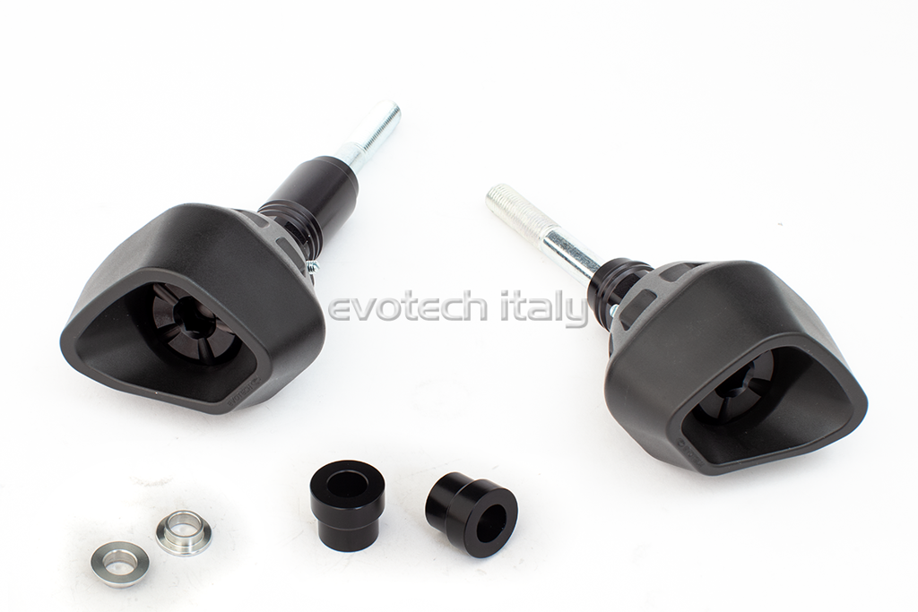 De nieuwe Evotech anti-schok frame sliders zijn ontworpen met het oog op het opvangen van de gevolgen van een val. Dit betekent dat het effect wordt geabsorbeerd door de sliders in plaats van direct op het frame. Bij een val wordt de slider over een conische spacer geschoven. Hierdoor wordt de energie van de impact verlaagd. Tests die zijn uitgevoerd in zowel laboratorium en op straat toonde een significante daling van de impact op het frame ten opzichte van de normale sliders. De slider is gemaakt van een kunststof mix met glasvezel. Het combineert high impact absorptie en glijweerstand tot lage wrijving op het asfalt. Op deze manier glijdt de pad over het asfalt zonder overmatige slijtage en gevaarlijke 'springen'. De aerodynamische vorm van de slider geeft niet alleen een agressievere look aan de motor, maar vermindert ook de kans dat de slider blijft hangen achter een obstakel. Op de slider is ook een markering/schaal aangebracht zodat na een val een indicatie van de kracht wordt gegraveerd. De main body is gemaakt van vliegtuig billet aluminium en zwart geanodiseerd voor een lange levensduur. De set is speciaal gemaakt om de impact van een val te verlagen aan het frame. Alle onderdelen zijn los leverbaar.