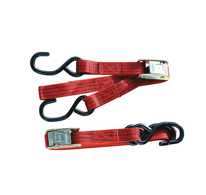 Set sterke rode spanbanden. De haken hebben een vinyl laag tegen beschadigen. Lengte 1,80m, breedte 25mm, 300kg per band