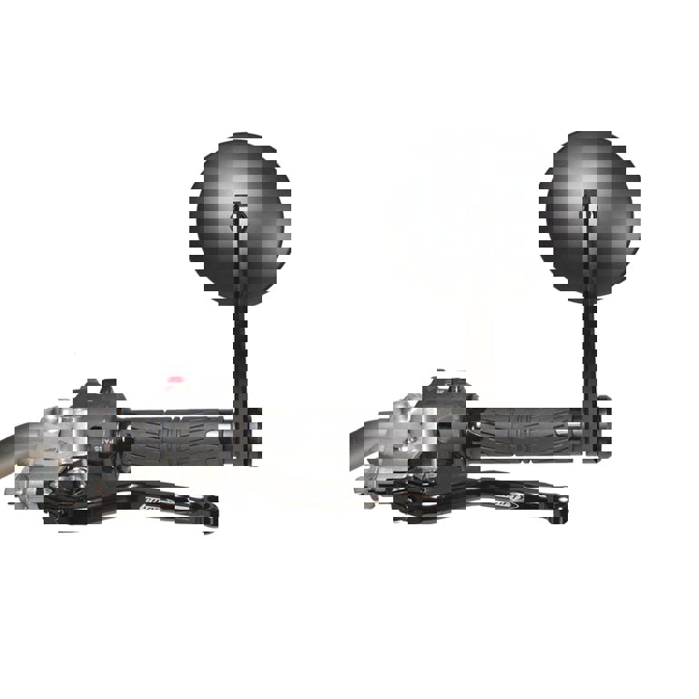 Mooie universele spiegel voor montage aan het uiteinde van het stuur Zowel links als rechts te gebruiken en veelvoudig verstelbaar Met CE keur Afmeting : totale lengte 240mm, lengte pootje 180mm, doorsnede glas 95mm Inclusief bevestigingsset