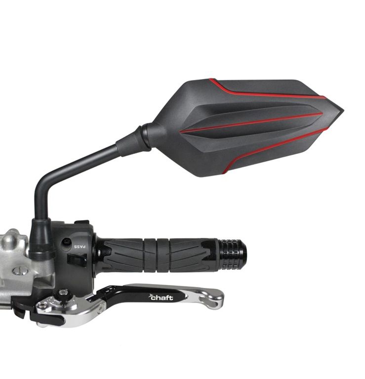Mooie zwart/rode stuurspiegel van Chaft -te gebruiken voor de linker- en rechterkant -verstelbaar -met CE keur -montage op het het stuur, met M10x1,25 aansluiting -afmeting: totale breedte: 296mm, glas: 171x87mm -leverbaar in zwart, zwart/blauw en zwart/rood