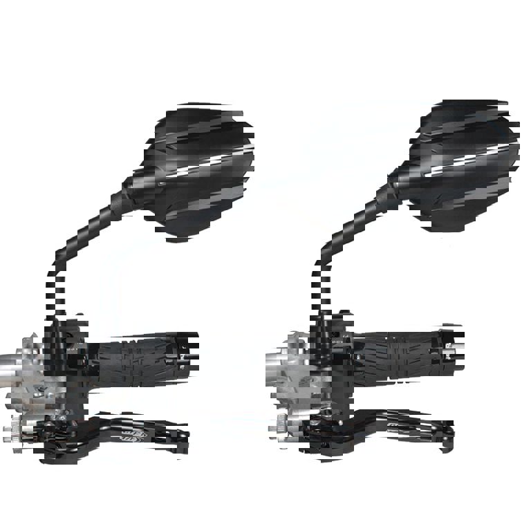 Mooie stuurspiegel van Chaft, mat zwart met een wit gekleurd biesje -te gebruiken voor de linker- en rechterkant -verstelbaar -met CE keur -montage op het het stuur, met M10x1,25 aansluiting -wordt geleverd met Yamaha adapter -afmeting: totale breedte: 230mm, glas: 145x90mm -leverbaar in zwart, blauw en rood