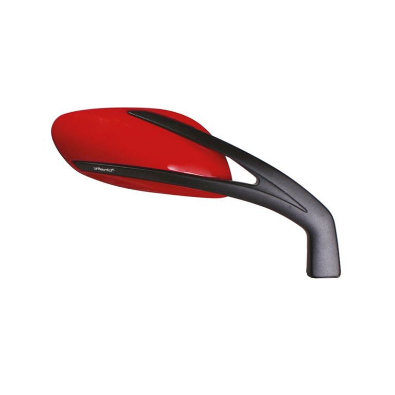 Mooie stuurspiegel van Chaft. Zwarte steun met rood spiegelhuis -te gebruiken voor de rechterkant -verstelbaar -montage op het het stuur, met M10x1,25 aansluiting -zie tekening voor de maten -inclusief Yamaha adapter -leverbaar in mat zwart, carbon, wit, groen en rood