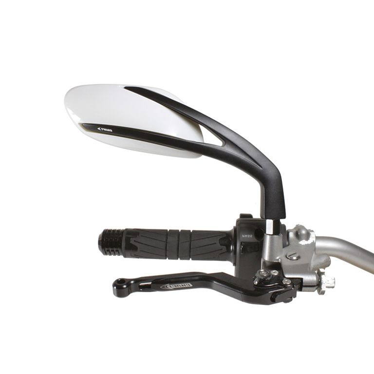 Mooie stuurspiegel van Chaft. Zwarte steun met wit spiegelhuis -te gebruiken voor de rechterkant -verstelbaar -montage op het het stuur, met M10x1,25 aansluiting -zie tekening voor de maten -inclusief Yamaha adapter -leverbaar in mat zwart, carbon, wit, groen en rood