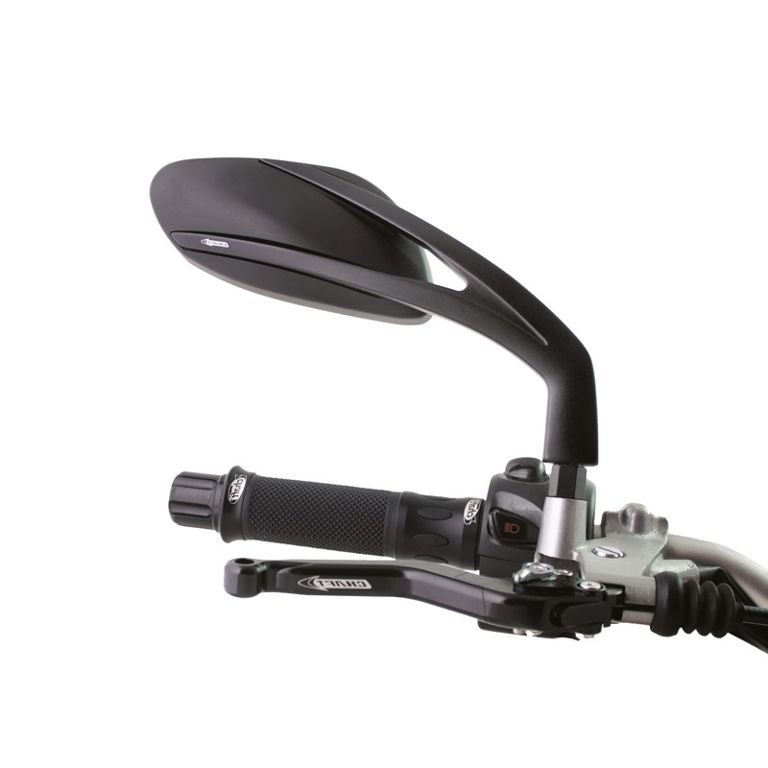 Mooie stuurspiegel van Chaft. Zwarte steun met zwart spiegelhuis -te gebruiken voor de rechterkant -verstelbaar -montage op het het stuur, met M10x1,25 aansluiting -zie tekening voor de maten -inclusief Yamaha adapter -leverbaar in mat zwart, carbon, wit, groen en rood