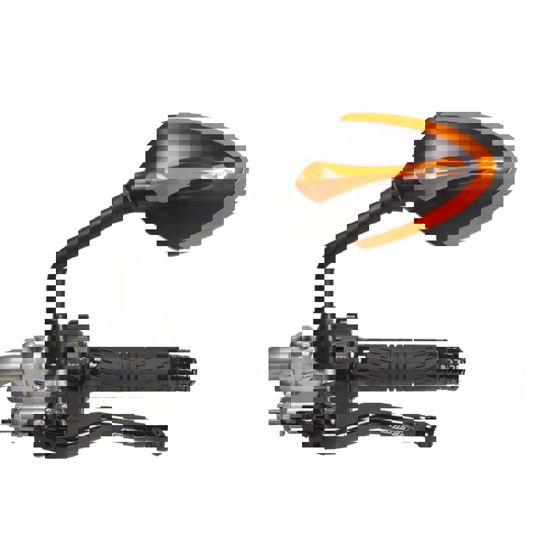 Mooie zwart/oranje spiegel van Chaft Te gebruiken voor de linker- en rechterkant Met CE keur Montage op het het stuur, met M10x1,25 aansluiting Afmeting: totale breedte: 260mm, glas: 140x90mm