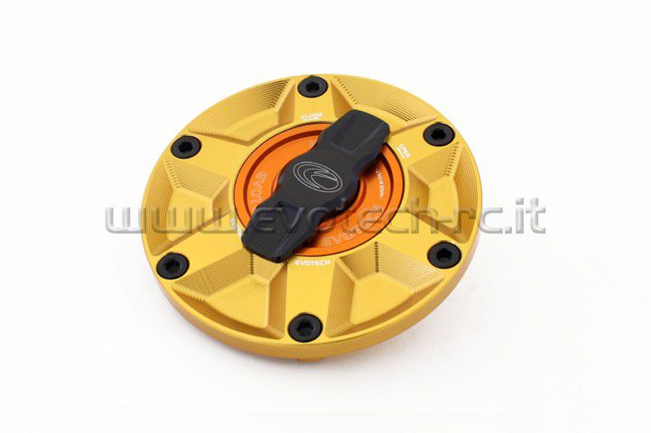Tankdop met snelsluiter van Evotech voor diverse Aprilia / Triumph / MV Agusta goud/oranje