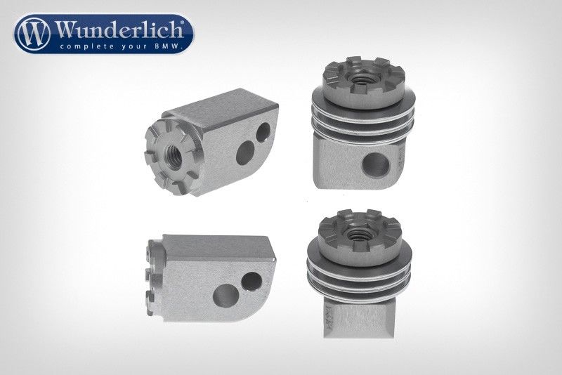 Our Vario rest system is the ultimate solution when it comes to adjustable footrests. With an adjustment range of 100 mm diameter, it leaves nothing to be desired. No matter whether you've got big feet or small ones, whether you want to increase the lean angle freedom or just comfortably relieve the knee angle. The eightfold adjustment option of a full 360° ensures enormous flexibility. This win for comfort is available for rider and passenger. For sporty riders, we also offer the rests in a bevelled design. The delivery always comes with ABE. All parts are made from high-solidity aluminium and anodises in silver or black.The Vario joint, the Vario adapter and the desired footrest for each side are all required for complete assembly.The base of the system is the silver or black Vario joint that matches the corresponding vehicle model, with the joint being mounted on the footrest bracket in place of the footrest.A Vario adapter is mounted on this, the adapter is also available in silver or black and is available in lengths of 23 mm (item no. 25912-000 in silver, 25912-002 in black), 30 mm (item no. 25912-030 in silver, 25912-032 in black) or (item no. 25912-050 in silver, 25912-052 in black) 50 mm. It can be attached in eight different directions.The silver (item no. 25911-001) or black footrest (item no. 25911-002) is now attached to the adapter, which can also be fitted with a rubber insert (item no. 25913-002).Vario joint rider (pair) BMW R1200R(S) LC// R Nine T Urban G/S// S1000XR - silver WunderlichEigenschappen: